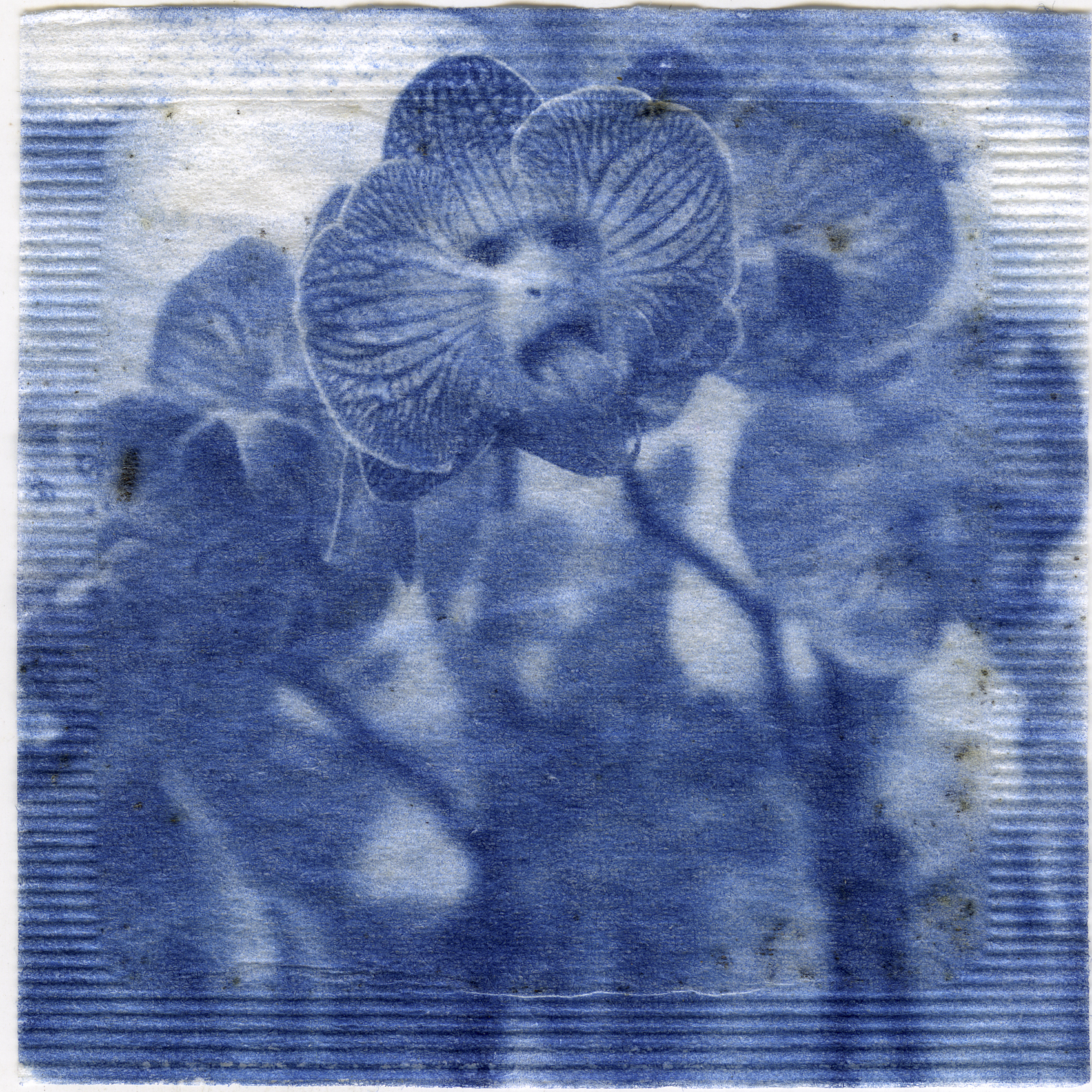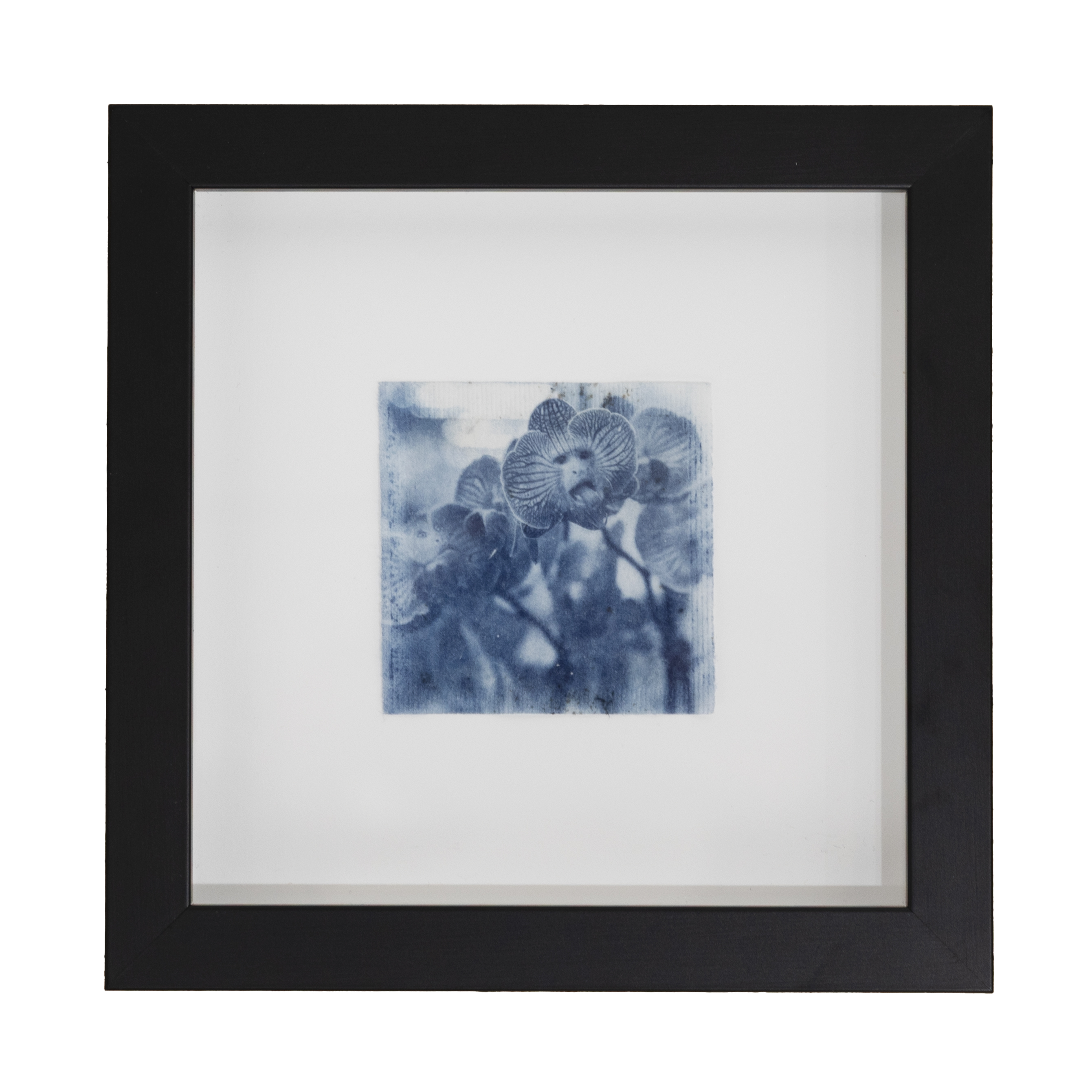 2.5x2.5” cyanotype on teabag mounted in a 6x6” black frame.